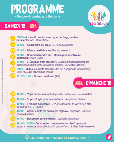 Rendez-vous les 15 et 16 novembre 2025 à La Commune (Lyon 7) pour deux journées de rencontres, d’échanges, de création et de célébration autour de la santé, du plaisir et de l’éducation sexuelle et affective.